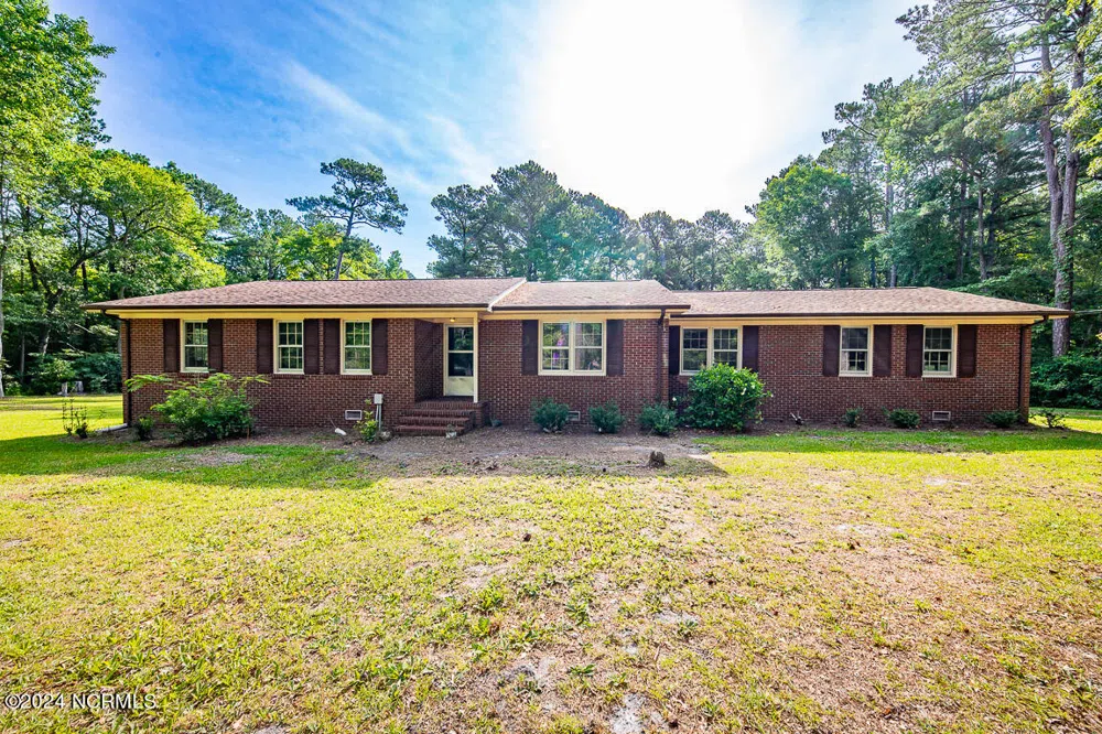 Welcome to 10279 NC 306 in beautiful Arapahoe, NC! This unique property offers not one, but two parcels for the price of one, providing you with an expansive 3.9 acres of UNRESTRICTED land. As you drive down the long dirt driveway, you'll be greeted by your 3 bedroom, 2-bathroom brick home nestled on a private lot surrounded by mature trees. The home retains its original 70s charm with wood trim, wallpaper, and vintage lighting fixtures, while also featuring modern renovations such as new LVP flooring, new insulation, and a new vapor barrier. Upon entering, you'll find an expansive room to your right featuring a wall-to-wall built-in desk with cabinets, drawers for storage, and perfect for a home office or library. The spacious living area boasts wood paneling and an original brick fireplace, creating a cozy atmosphere. The country kitchen, with its original cabinets, opens into your eat-in dining area. Off the kitchen is the laundry area, complete with washer and dryer hookups, built-in vanity, and storage cabinets, leading to the backdoor—ideal for a utility closet and mudroom. The primary bedroom includes a private bathroom, while the two additional bedrooms share a full-sized renovated bathroom. Step outside to discover a covered concrete patio overlooking a fully fenced yard. Beyond the fence, explore the rest of your wooded lot. Additionally, the property includes a large, detached 40X30 shed wired for electricity, making this a perfect workshop or she shed! Less than 30 minutes from Historic downtown New Bern and 3 minutes from Minnesott Beach Ferry giving you easy access to Crystal Coast Beaches. This opportunity is once in a lifetime! Don't MISS THIS!!